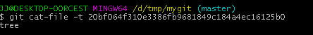查看它的类型可以看到控制台返回了 tree,这就是 git 对象中的树对象 (tree object)