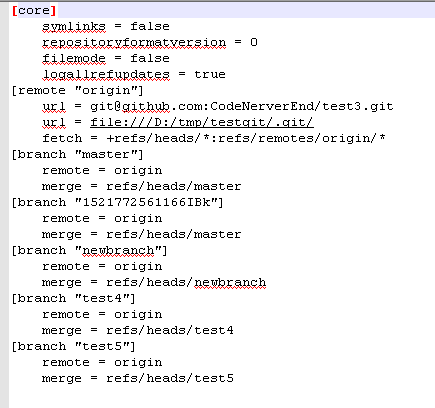 3. 当前使用仓库的 .git 目录中的 config 文件:只针对该仓库,一些分支的信息和远端仓库的信息以及 fetch,push操作的信息都有保存。
