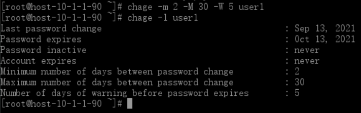 例如下面的命令要求用户user1两天内不能更改口令,并且口令最长的存活期为30天,并且口令过期前5天通知用户