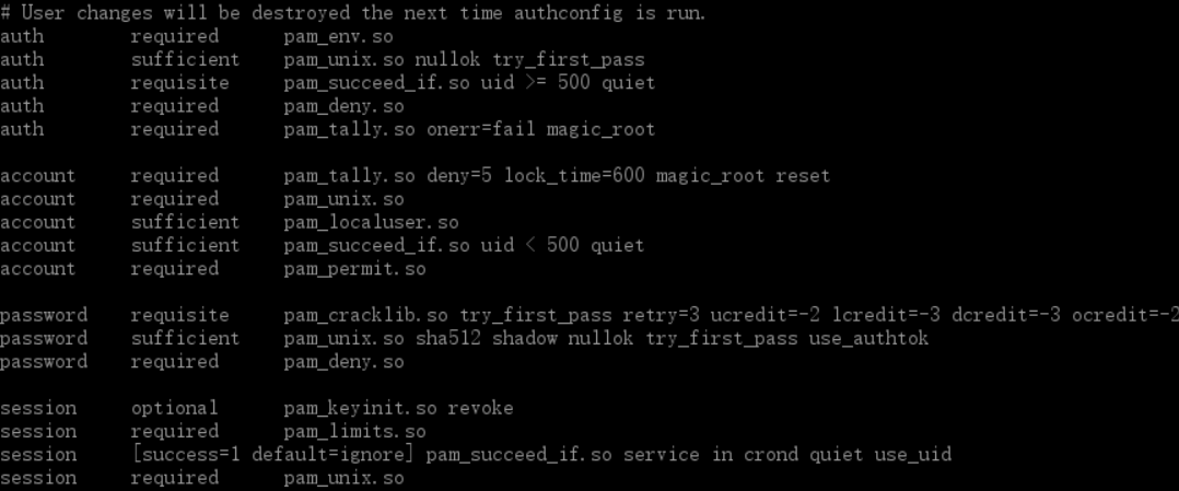 修改/etc/pam.d/system-auth配置:(注意:在root用户下进行,其余用户对这个文件只有读的权限)