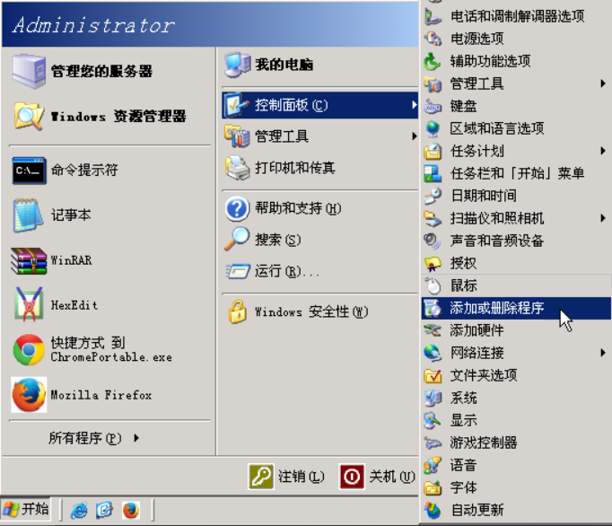 依次点击:“开始”->>“控制面板”->>“添加或删除程序”,以打开添加或删除程序对话框: