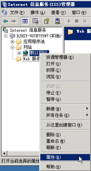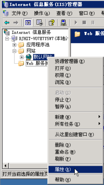安装完成后,打开IIS,右键“默认网站”,选择“属性”: