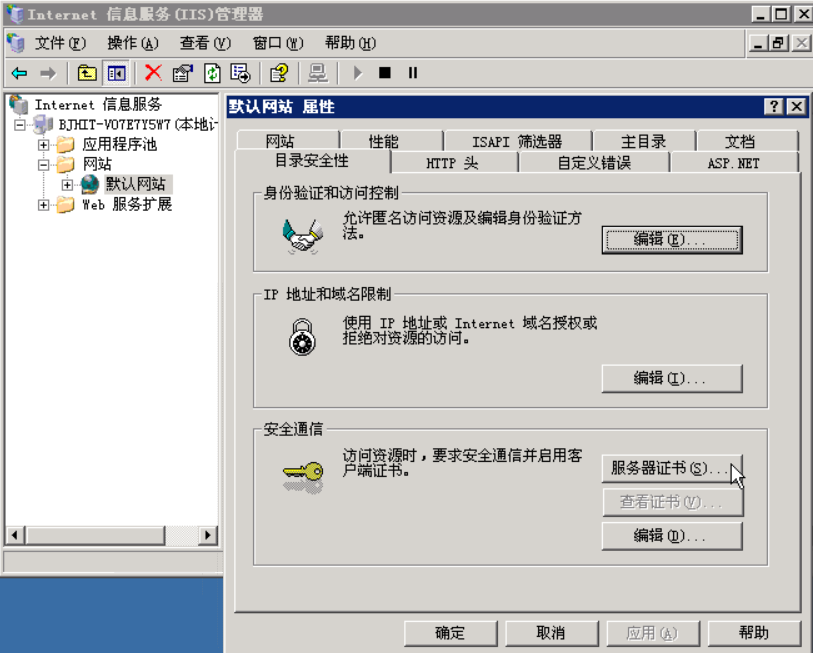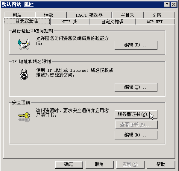 在“默认网站属性”中选择“目录安全性”标签,点击“服务器证书”:
