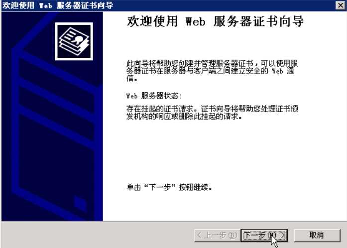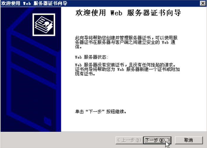 出现如下对话框,保持默认选项“新建证书”不动,继续下一步: