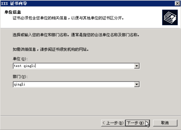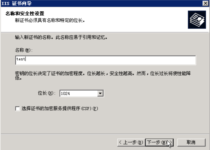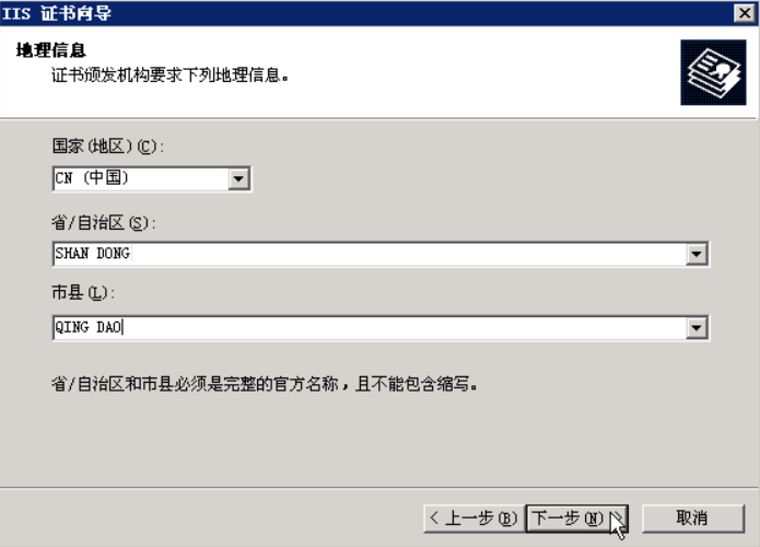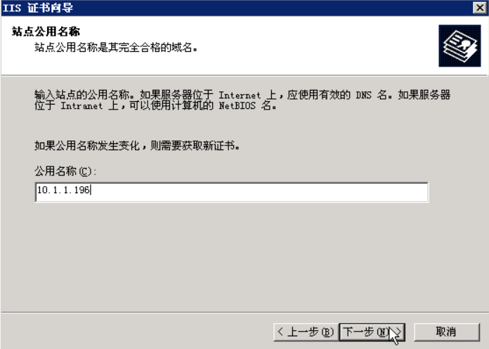 填写公用名称,由于在本环境中没有使用DNS服务器,没有域名因此使用IP地址访问,在公用名称中输入本机的IP地址,如果名称错误,后面过程中会出现问题,因此应仔细核对: