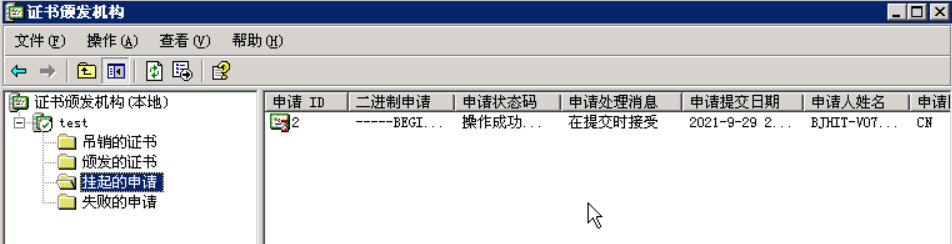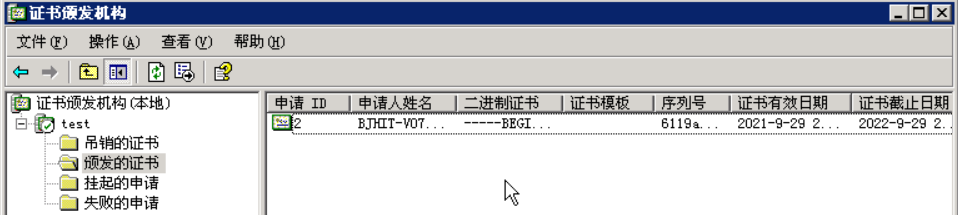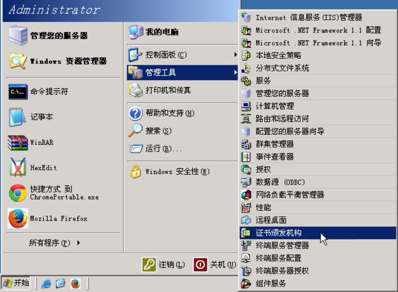 证书的颁发在证书服务器中操作,接下来的操作是证书审核员的角色,切换到CA服务器,点击“开始”>>“管理工具”>>“证书颁发机构”: