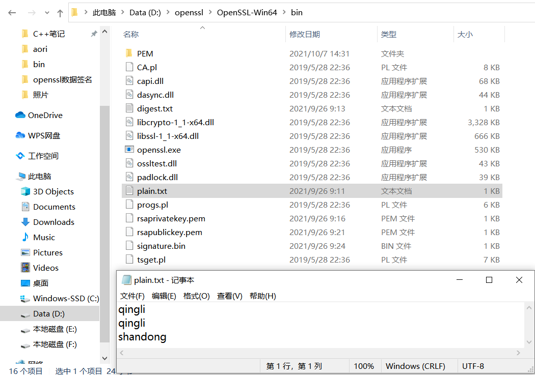 1、在 openssl/bin 下创建明文文档plain.txt,写入内容。