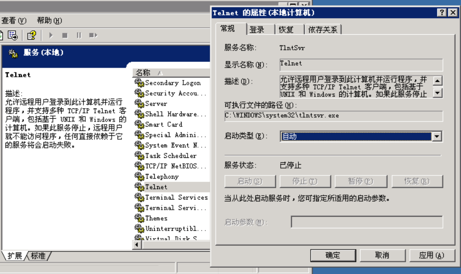 找到Telnet服务,然后更改启动类型为自动,并且启动Telnet服务