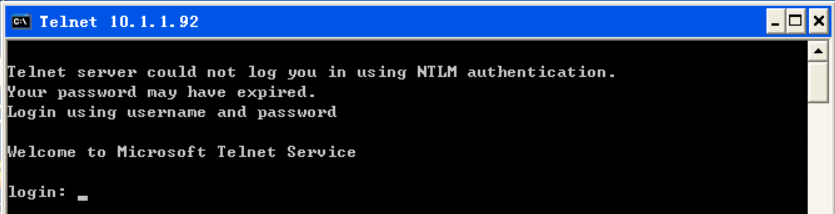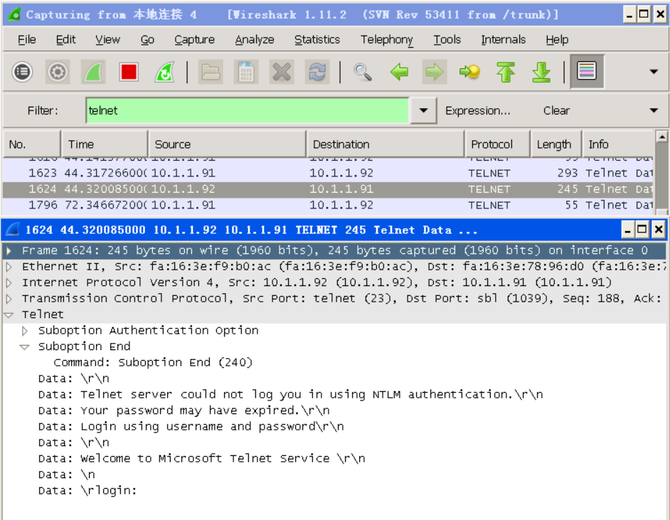 到xp上,安装好Wireshark,然后Telnet server的IP,如telnet 10.1.1.44,然后就能看到欢迎界面
