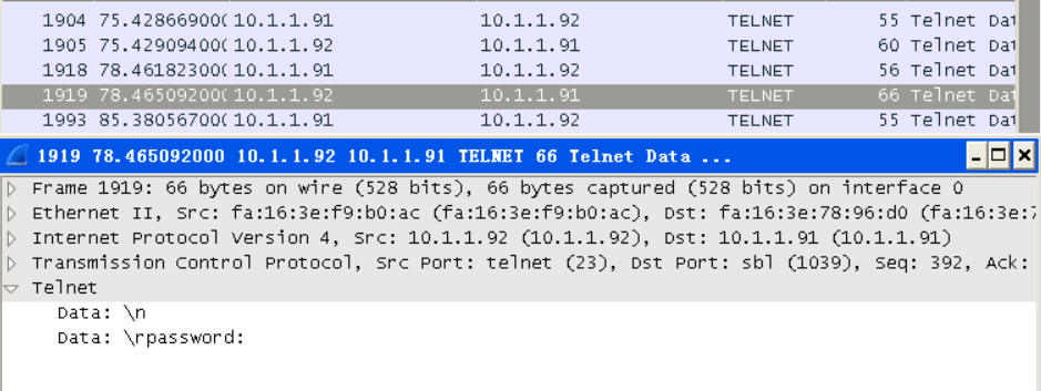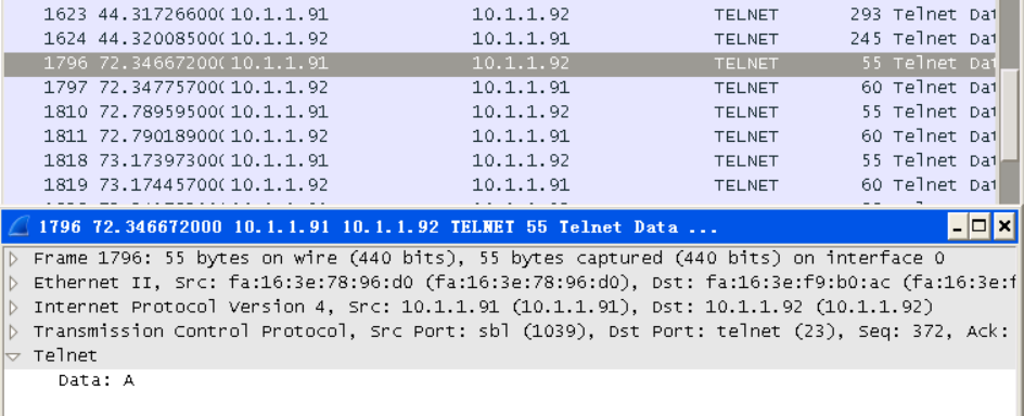 重新连接Telnet,然后在Wireshark中找到包