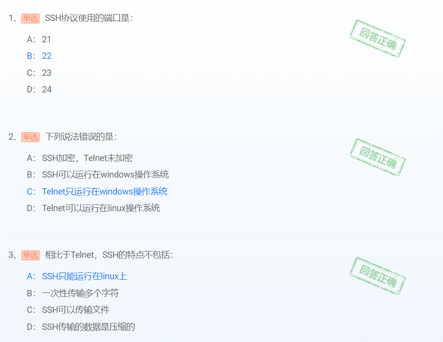 答:telnet连接的时候直接建立TCP连接,所有传输的数据都是明文传输,所以是一种不安全的方式;SSH 为建立在应用层基础上的安全协议,是比较可靠安全的协议。