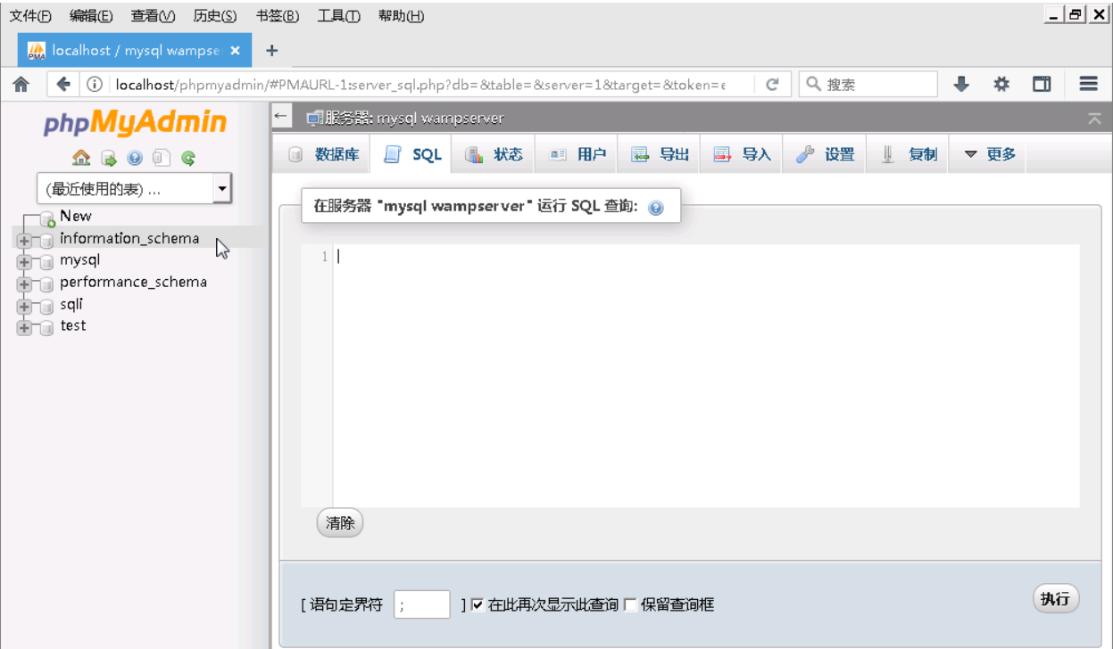 需要注意的是,要在information_schema这个数据库中执行该SQL语句。如何进入information_schema数据库执行SQL语句,请参考前面进入sqli数据库执行SQL语句的步骤。