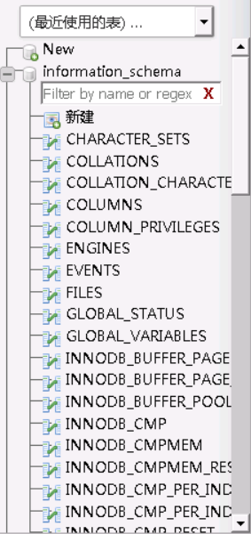 展开后如下图,显示了该数据库中的所有表,由于表数量太多,只截了一部分,可以拉动右边的滚动条查看所有表。