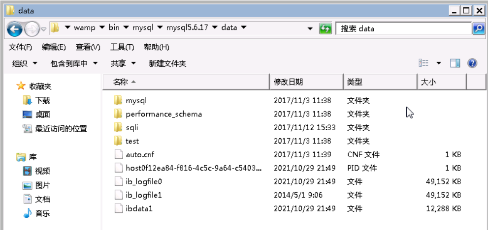 这上面显示的表,它们实际上是视图,而不是基本表,所以你在数据库的数据保存目录,会看不到这个数据库的实体文件。数据库的数据保存在 C:\wamp\bin\mysql\mysql5.6.17\data 目录,在这个目录下一共有如下4个目录: