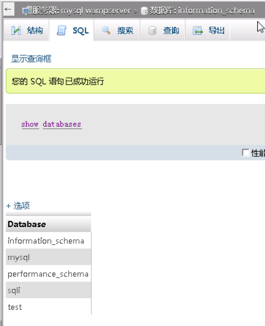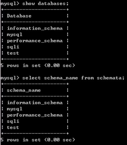 可以看到他们的作用是一样的,都是列出所有数据库,跟我们前面说的一样,SCHEMA_NAME字段保存了所有的数据库名。