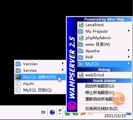 点击右下角的wampserver图标,如果没有该图标,可以双击桌面的WampServer运行。