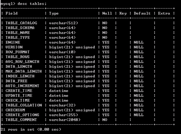 desc 可以用来看表结构。看下tables的表结构,执行desc tables;,结果如下图: