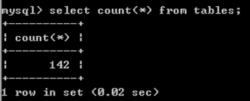 注意上图中第2、3条记录,每一条记录中,他们分别记录一个表名和一个这个表所属的库名。其中TABLE_NAME保存的是表名,而TABLE_SCHEMA保存的是这个表名所在的数据库。我们可以查询一条记录看看,在查询前,先看看有多少条记录,避免记录太多查看不方便,执行select count(*) from tables; 结果如下图:
