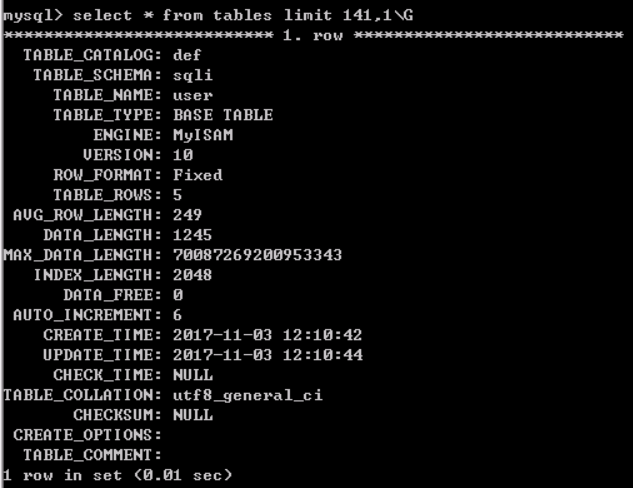 说明当前所有数据库中的表数量为142。查询任意一条记录查看,我这里选择最后一条记录,SQL语句为:select * from tables limit 141,1\G由于在客户端中,默认查询结果显示不友好,所以,可以把语句后面的分号改成\G,他会让一条记录显示一行,看起来不那么乱。\G只支持在客户端中用,在其他连接数据库的软件中,使用\G会报错。