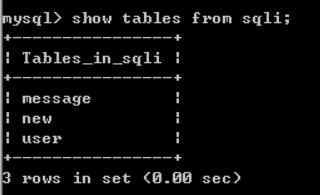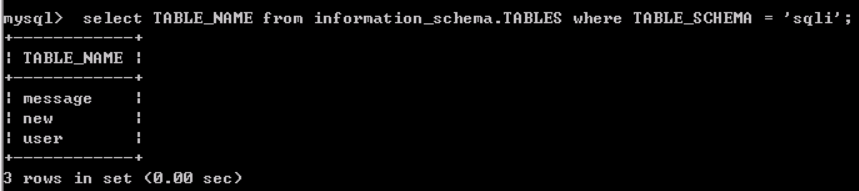 可以看到,最后一条记录的TABLE_NAME是user,TABLE_SCHEMA为sqli。查看sqli数据库中的表,SQL语句为:show tables from sqli;可以看到确实存在user表。