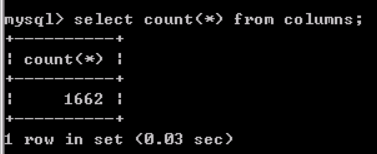 这里面,与注入相关的存在3个字段,分别是TABLE_SCHEMA、TABLE_NAME以及COLUMN_NAME,不难猜到,如果在该表中查询一条记录,TABLE_SCHEMA保存了这条记录保存的字段所属的数据库名,而TABLE_NAME保存的是该字段所属表名,COLUMN_NAME则是一个列名记录,查询一条记录验证一下,首先确定该表有多少条记录,执行select count(*) from columns;,得知一共有1662条记录,结果如下图: