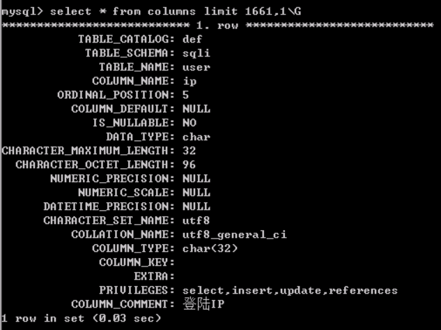 我们获取最后一条记录,执行select * from columns limit 1661,1\G