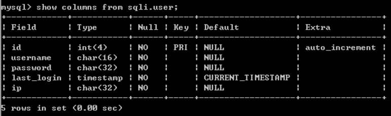 查询结果与show columns from sqli.user; 一致。