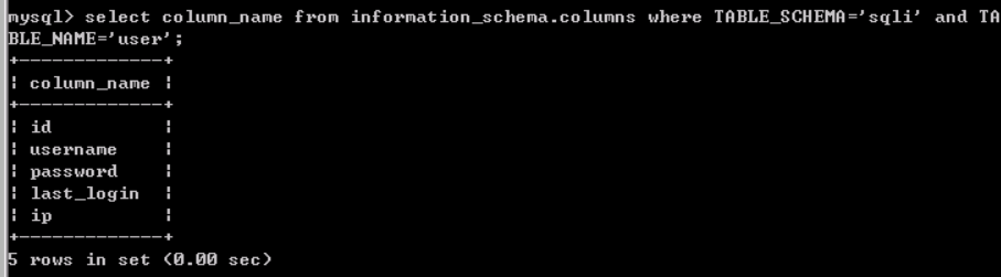 select column_name from information_schema.columns where TABLE_SCHEMA='sqli' and TABLE_NAME='user';