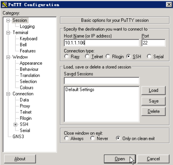 登录实验机后,打开桌面上的putty程序,输入10.1.1.106,再点击Open.。