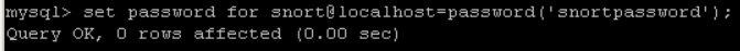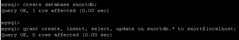 mysql> grant create, insert, select, update on snortdb.* to snort@localhost;