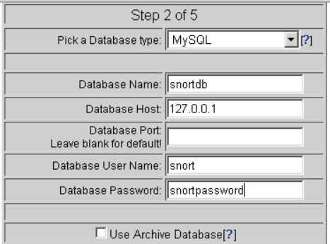 输入数据库信息,Pick a Database type:MySQL,Database Name:snortdb,Database Host:127.0.0.1,Database User Name:snort,Database Password:snortpassword