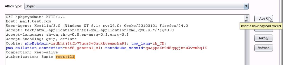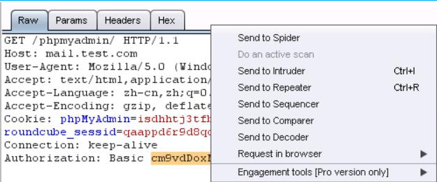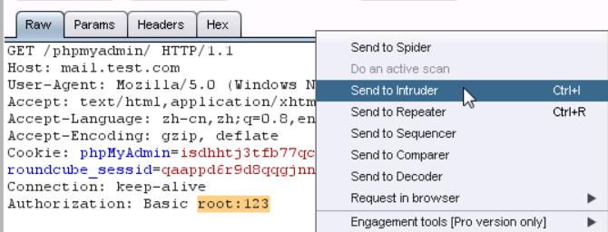 5、接下来对phpmyadmin进行暴力破解,随便输入一个用户名和密码,比如此处我输入:用户名:root 密码:123,页面提示错误,然后查看burpsuite截获到的数据包。
