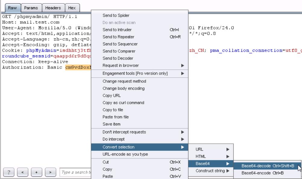 6、找到Authorization,选中Basic后边的字符串,进行如下步骤:右键convert selection->base64->base64-decode。