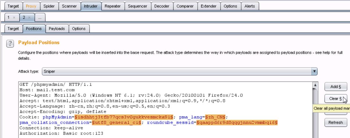 8、右键send to intruder,在Positions选项卡下单击clear$。