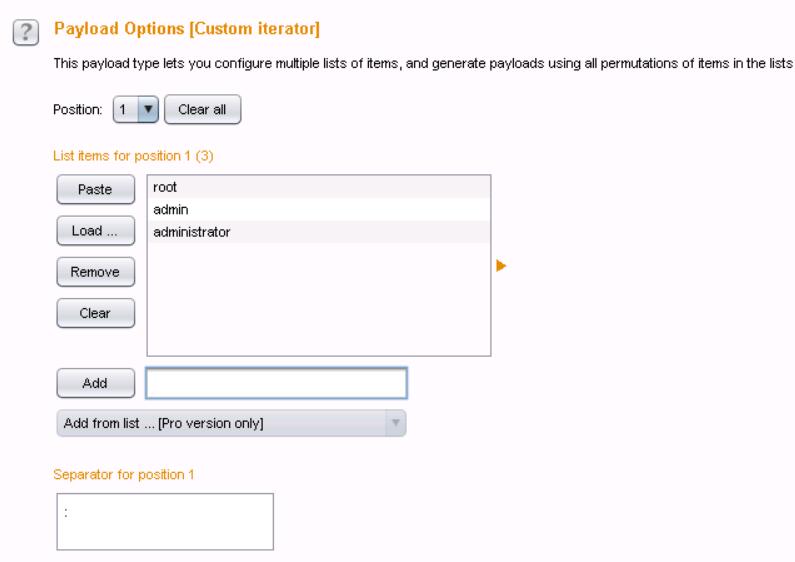 10、切换到payloads选项卡下,设置payload type,在add处添加用户名,separator for position1 处添加一个冒号。