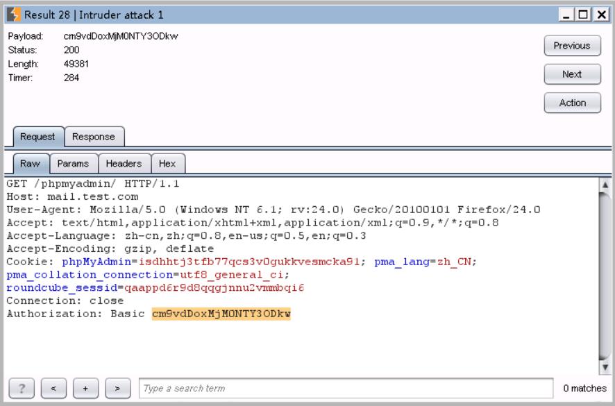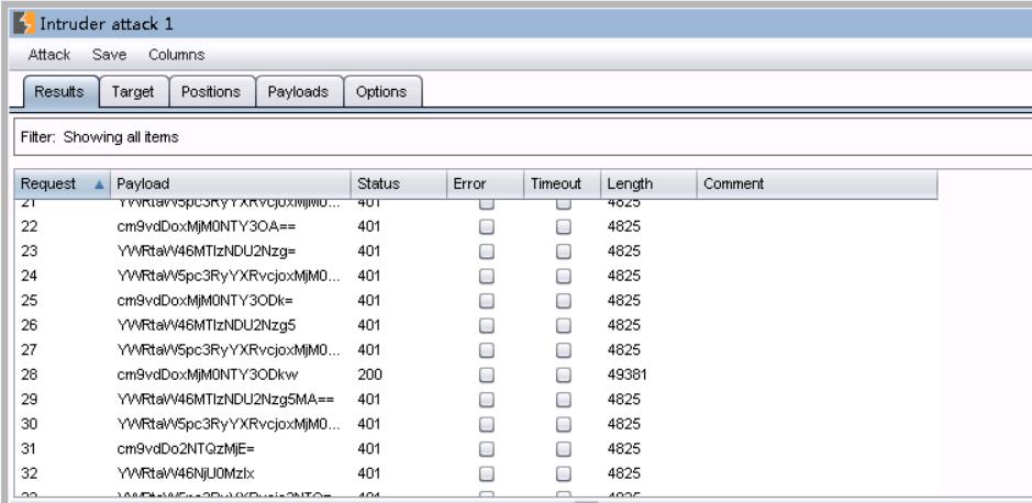 14、单击intruder下的start attack,一段时间后,发现了一个length和其他的不同。