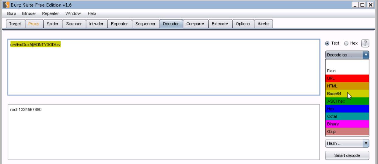 16、粘贴在decoder下,选择decode as base64,可以看到用户名密码为root:1234567890,登录。