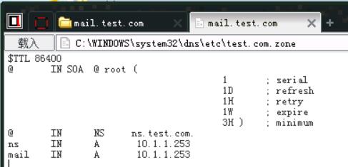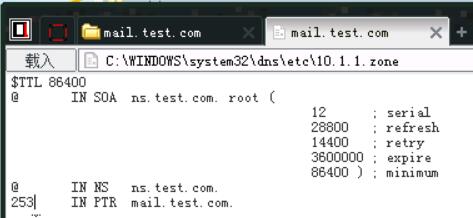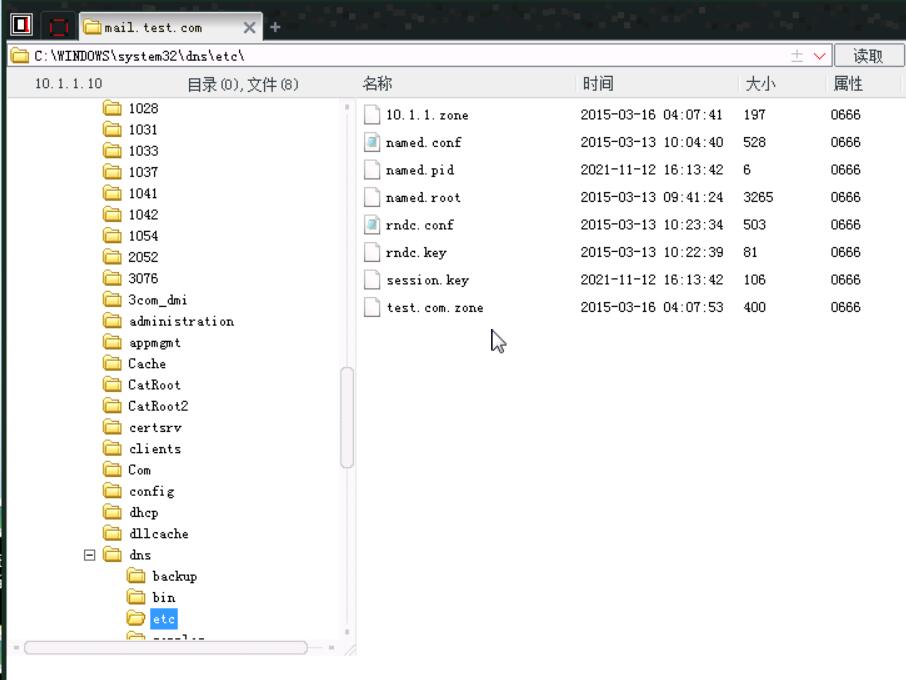 21、接下来我们需要对这台服务器进行域名劫持,将其劫持到一台IP为10.1.1.253的主机上,找到C:\WINDOWS\system32\dns\etc中的test.com.zone和10.1.1.zone。