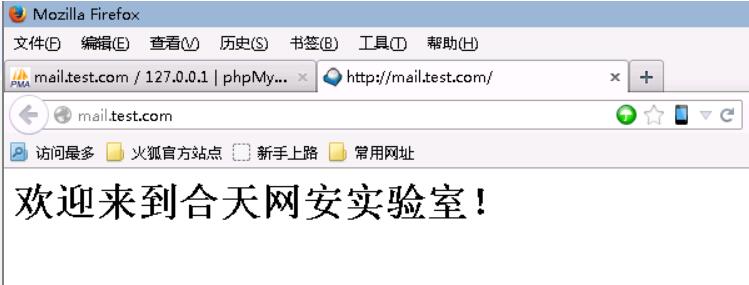 25、刷新 http://mail.test.com,发现劫持成功。页面会显示为:“欢迎来到合天网安实验室!”
