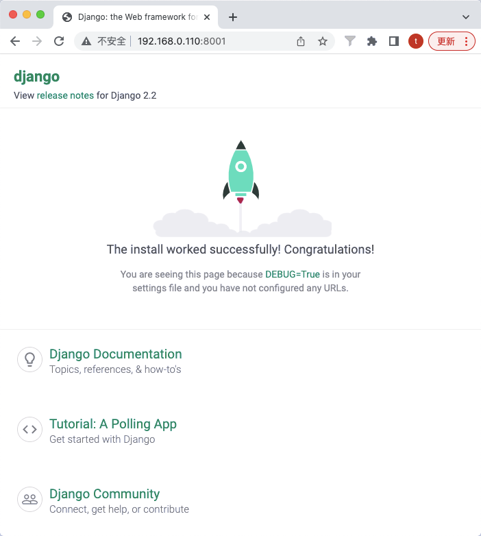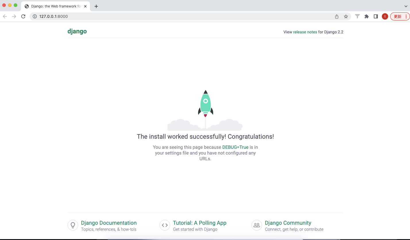 通过http://127.0.0.1:8000/进入Django初始页面,也可通过http://localhost:8000/访问