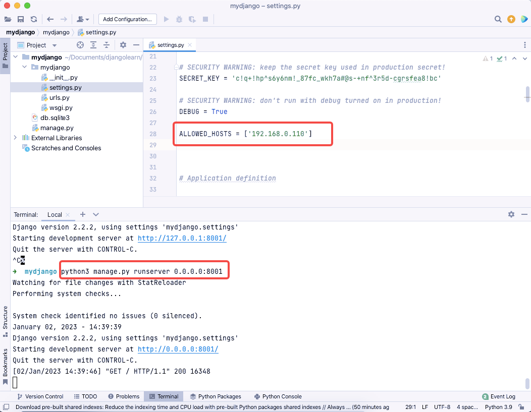 若想通过本机ip访问,则需要在settings.py中找到ALLOWED_HOSTS配置ip,如下截图,若想所有人都可访问则配置ALLOWED_HOSTS = ['*']