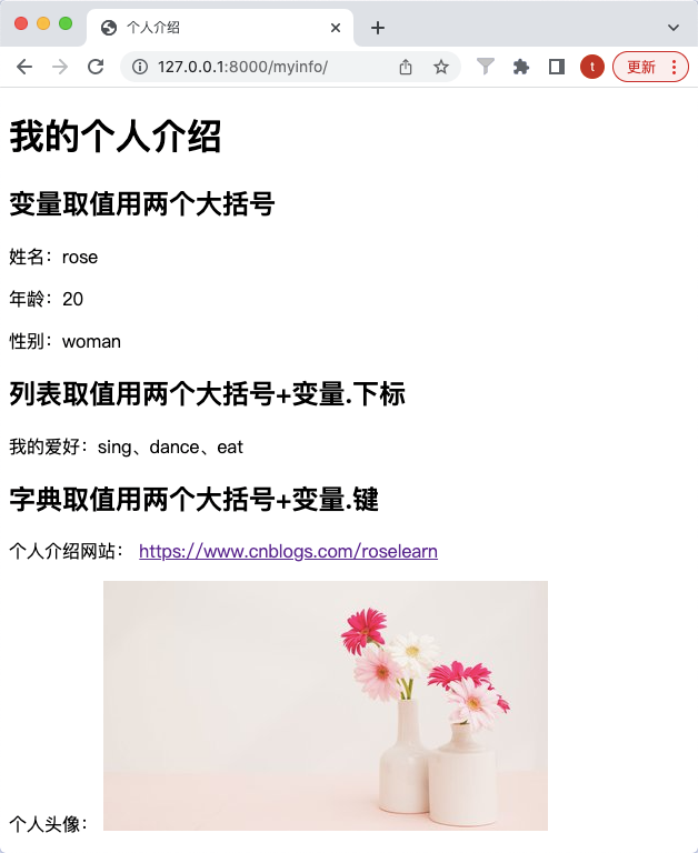 变量取值用{{变量}},列表取值用{{变量.下标}},字典取值用{{变量.键}}