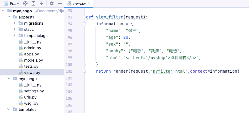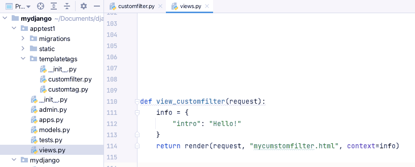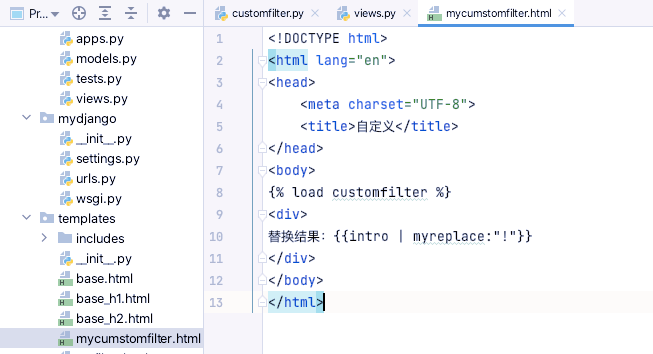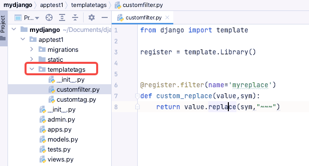 在app下创建python文件夹且名称必须为templatetags,再在文件夹下创建自定义过滤器python文件,如下图customfilter.py,该段代码实现了将sym替换成~~~