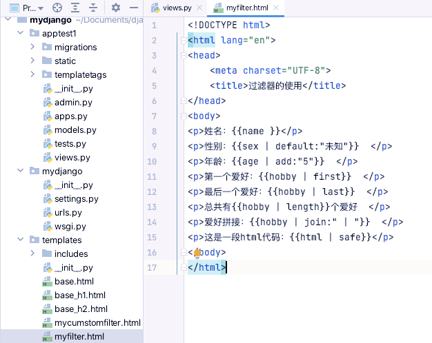 需要先加载自定义过滤器,语法 {% load 过滤器文件名称 %}