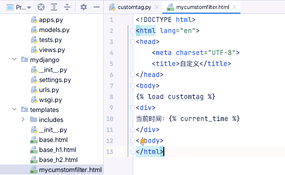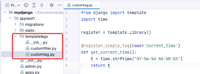 在templatetags下创建自字义标签python文件,如下图customtag.py,实现了获取当前时间