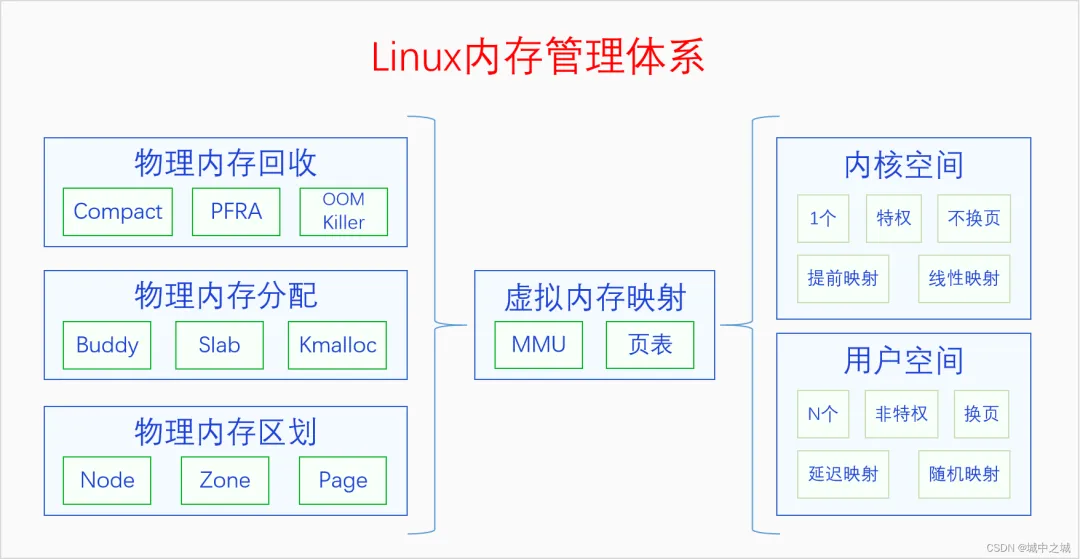 目前绝大部分的操作系统采用的内存管理模式都是以分页内存为基础的虚拟内存机制。虚拟内存机制的中心是MMU和页表,MMU是需要硬件提供的,页表是需要软件来操作的。虚拟内存左边连着物理内存管理,右边连着虚拟内存空间,左边和右边有着复杂的关系。物理内存管理中,首先是对物理内存的三级区划,然后是对物理内存的三级分配体系,最后是物理内存的回收。虚拟内存空间中,首先可以分为内核空间和用户空间,两者在很多方面都有着显著的不同。内核空间是内核运行的地方,只有一份,永久存在,有特权,而且其内存映射是提前映射、线性映射,不会换页。用户空间是进程运行的地方,有N份,随着进程的诞生而创建、进程的死亡而销毁。用户空间中虚拟内存的分配和物理内存的分配是分开的,进程只能分配虚拟内存,物理内存的分配是在进程运行过程中动态且透明地分配的。用户空间的物理内存可以分为文件页和匿名页,页帧回收的主要逻辑就是围绕文件页和匿名页展开的。