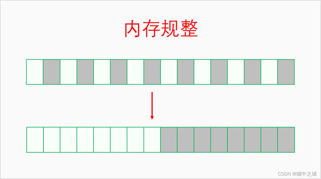 系统运行的时间长了,内存一会儿分配一会儿释放,慢慢地可用内存就会变得很碎片化不连续。虽然总的可用内存还不少,但是却无法分配大块连续内存,此时就需要进行内存规整了。内存规整是以区域为基本单位,找到可用移动的页帧,把它们都移到同一端,然后连续可用内存的量就增大了