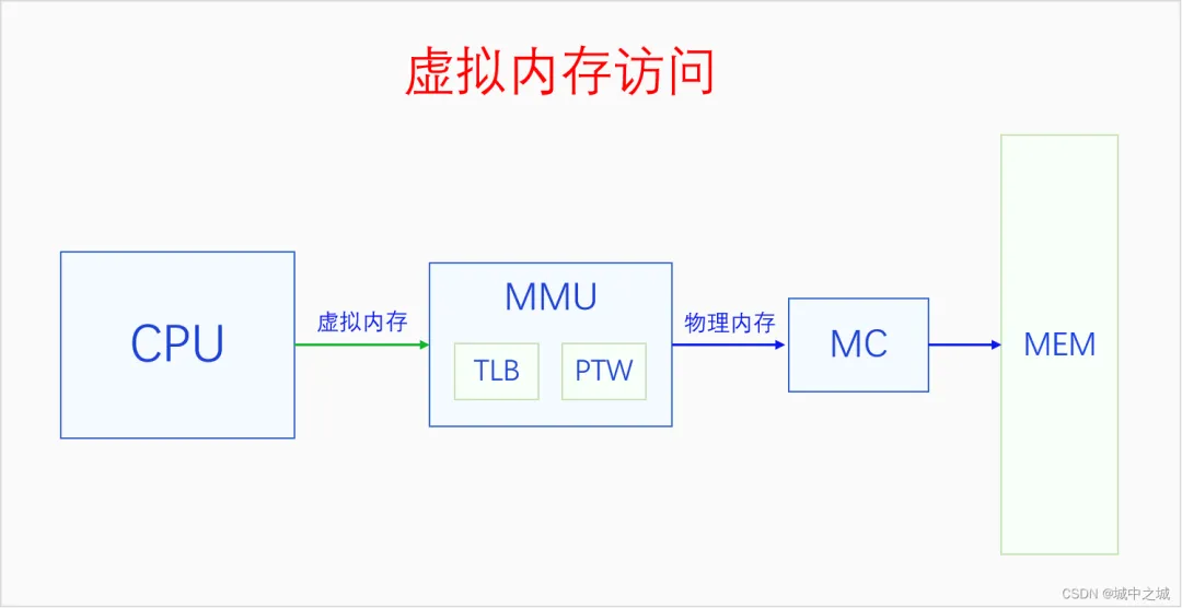 开启分页内存机制之后,CPU访问一切内存都要通过虚拟内存地址访问,CPU把虚拟内存地址发送给MMU,MMU把虚拟内存地址转换为物理内存地址,然后再用物理内存地址通过MC(内存控制器)访问内存。MMU里面有两个部件,TLB和PTW。TLB可以意译地址转换缓存器,它是缓存虚拟地址解析结果的地方。PTW可以意译为虚拟地址解析器,它负责解析页表,把虚拟地址转换为物理地址,然后再送去MC进行访问。同时其转换结果也会被送去TLB进行缓存,下次再访问相同虚拟地址的时候就不用再去解析了,可以直接用缓存的结果。