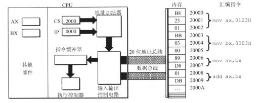流程:读取cs、ip到地址加法器->再到输入输出控制电路通过地址总线向内存中寻初始地址->读取对应地址所在的汇编指令并解码判断对应内存的机器指令(获取到内存中储存的机器指令再通过数据总线传回输入输出控制电路,同时IP偏移,cs:ip指向下一段汇编指令的起始地址)->机器指令送入cpu(->指令缓冲器->执行控制器)